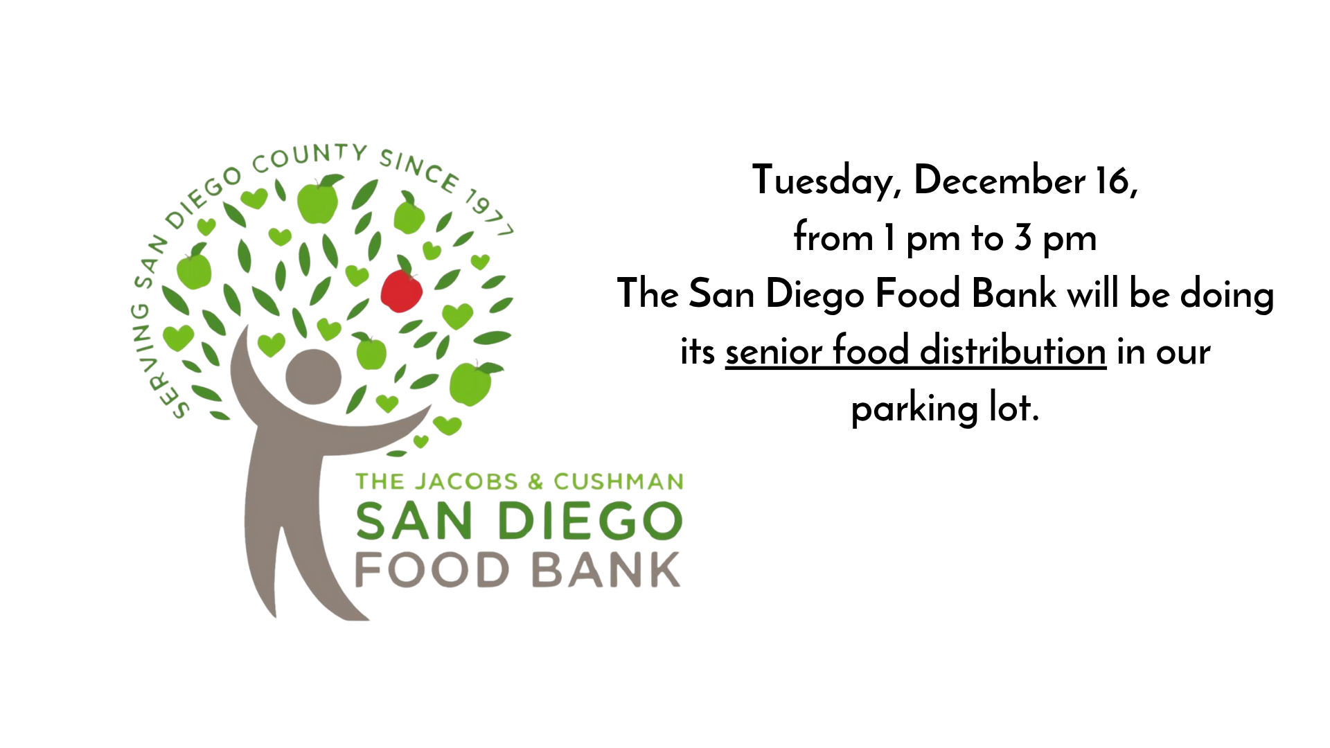 The San Diego Food Bank will host its Senior Food Distribution event in our facility’s parking lot. Starting January 2026, we will hold two distribution days each month. We apologize for any confusion about them starting this month. Please direct any questions about eligibility or service to the San Diego Food Bank.